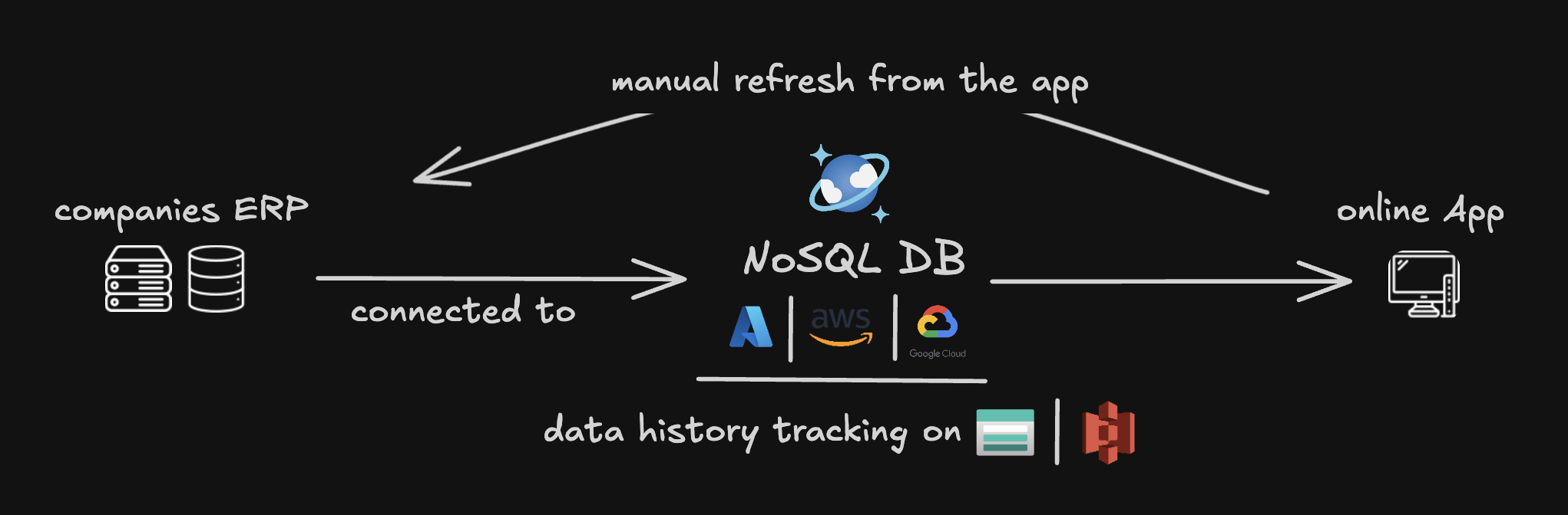 The system architecture is designed to be connected directly to the customer's ERP system in read-only mode, allowing for real-time data synchronization and analysis. This is achieved through the use of API endpoints that are exposed by the cloud-based ERP system and accessed by the data pipeline triggered by the user directly from the webapp.