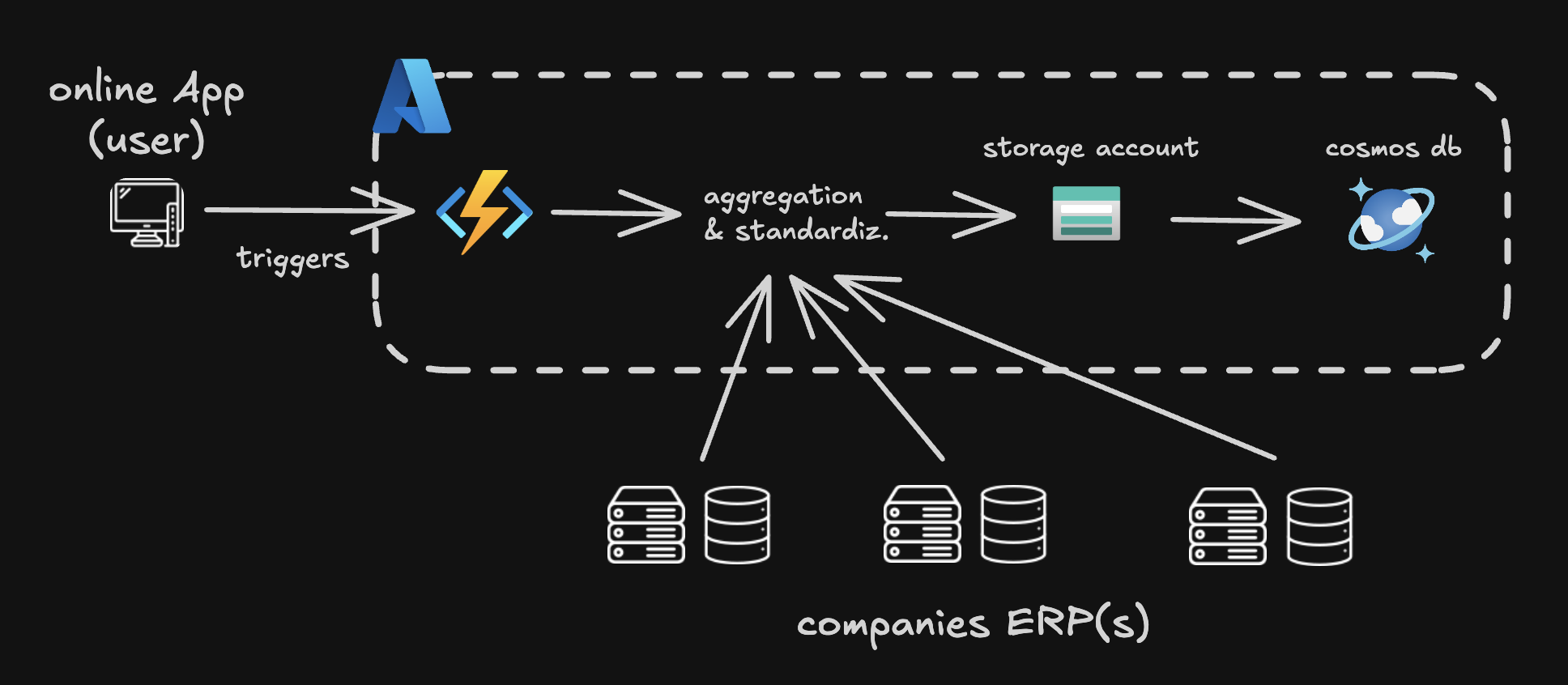 Whenever the pipeline is triggered, an Azure Function is invoked to provision a Python-based processing resource. This resource retrieves data from the ERP system, compares it with previously processed records to identify new entries, and updates the Storage Account accordingly. Finally, the processed data is loaded from the Storage Account into Azure Cosmos DB.